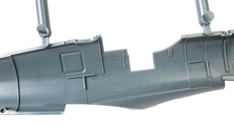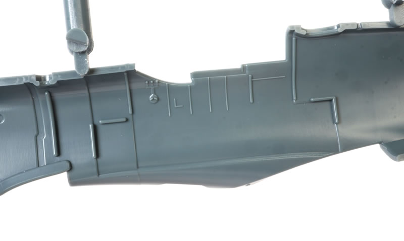 The fuselage and wings are on Sprue G. The fuselage halves on Sprue G represent the earlier Mk.Vb with the external armoured windscreen glass.