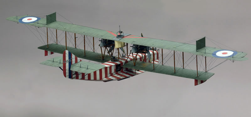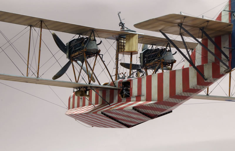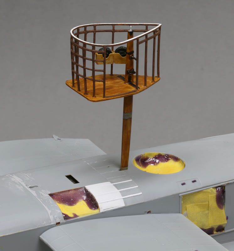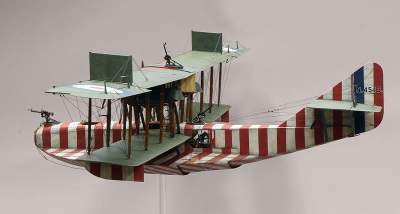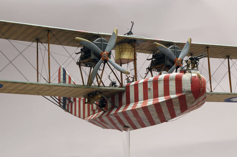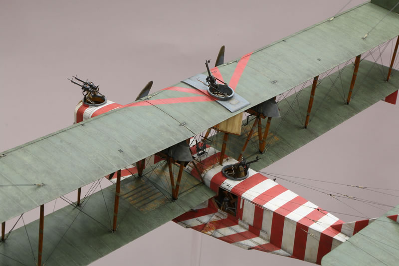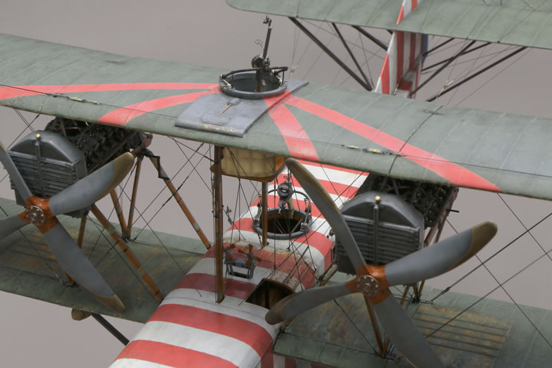 There was a little ladder that connected to the fuselage. I've presumed that the plywood walkway that runs over the top of the fuselage would have been extended forward on the port side to avoid the danger of the crew damaging the stretched canvas area that's normally between the walkway and the open hatch. I created all the markings using masks, including the serial number on the tail, and also added some red stripes on the top wing which are barely visible on the original photographs and which were, presumably, to remind the top gunner not to shoot through his own propellers, which would have been rather inconvenient.