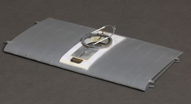 On the top section of wing the expanded 25 gallon petrol tank was re-created with various grades of plasticard and white epoxy filler, more copper wire to represent copper pipe, and an adapted spare piece of photo-etched brass from another kit to represent the little inspection hatch at the front.
