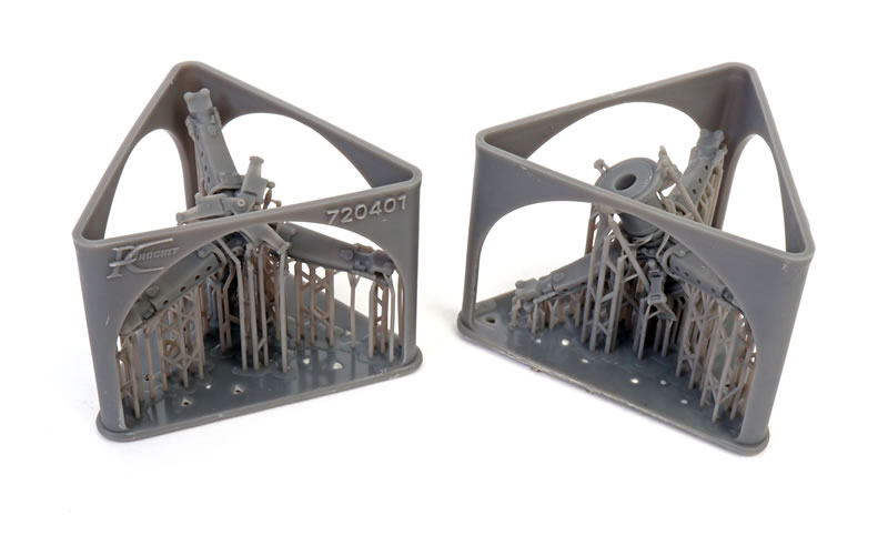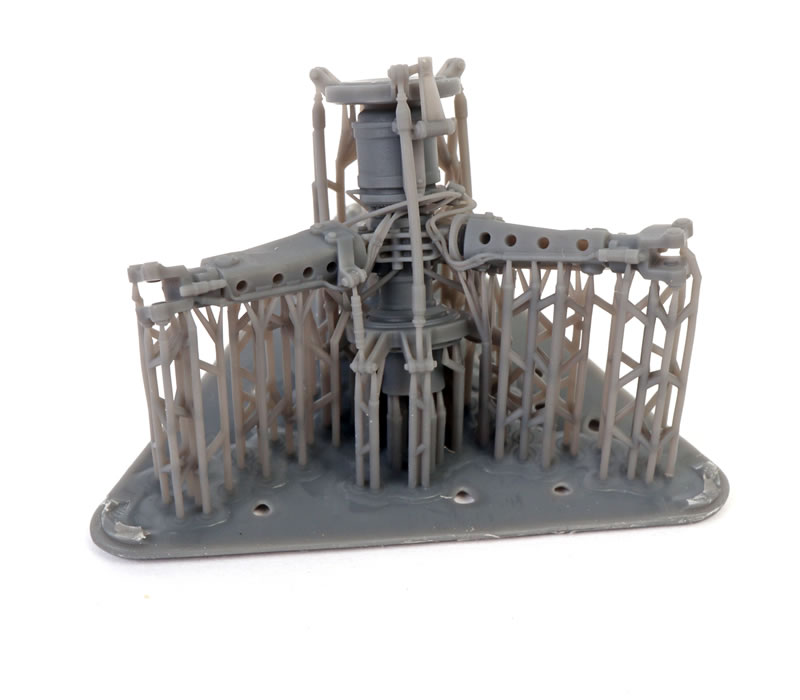 This set is 3D printed in dark grey resin and comes in a small strong clear plastic lidded box which will be useful for storing all kinds of small bits and bobs later. It consists of just two parts, each in a mass of fine supporting pillars whose removal will require quite some care as there are a lot of fine rods that are actually a part of the rotor. What emerges is a remarkable rendition of the two interlocking rotor heads, and it will require some careful painting. The diminutive instruction sheet shows which part is attached to which and indicates that a metal rod goes through the centre of the structure but there is no sign of this in the box. The rear of this sheet also shows that some minor chopping needs to be done to the kit rotor blades before they are fitted to the heads.