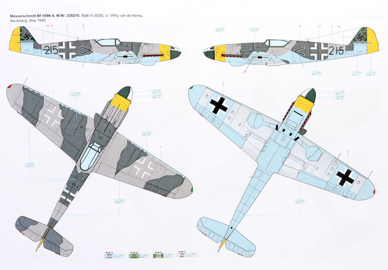 - Messerschmitt Bf 109 K-4, W.Nr. 335215, Stab II./JG52, Lt. Willy van de Kamp, Neubiberg, May 1945. Black Chevron 1, with the “last three” 215 on the rear fuselage overpainted by the II Grupper bar. Colour suggestions are ambiguous. The diagram seems to suggest a light mixed grey and RLM 75 Grey Violet, but the paint callouts are for RLM 82 Light Green, RLM 83 Dark Green and RLM 77 Light Grey. Once again, consult references and come to your own conclusion.