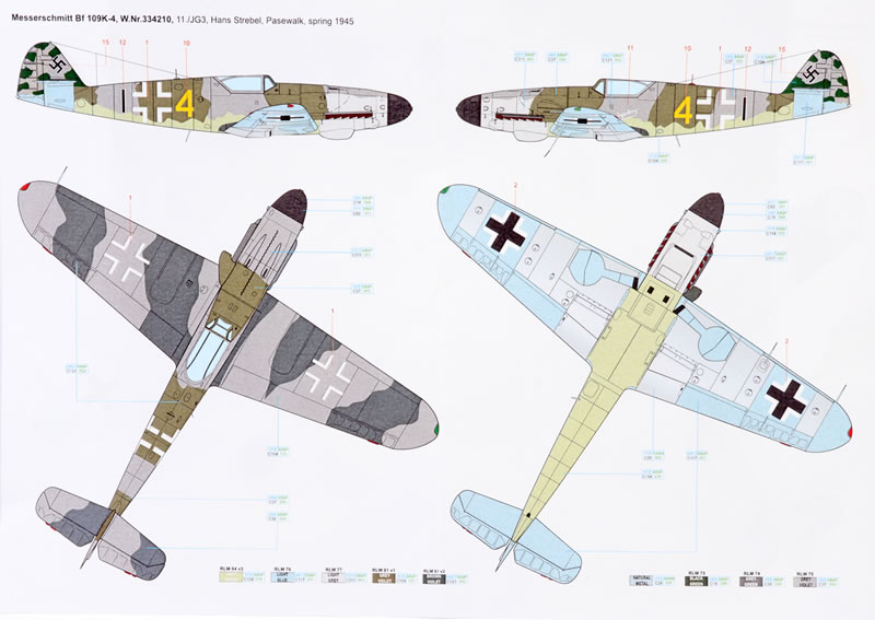 - Messerschmitt Bf 109 K-4, W.Nr.334210, 11./JG3, Hans Strebel, Pasewalk, spring 1945. Yellow 4. Camouflage is a combination of late-war colours, with a different treatment on the wings and fuselage. By all means follow the instructions if you wish, but also check your references to see if you draw the same conclusions.