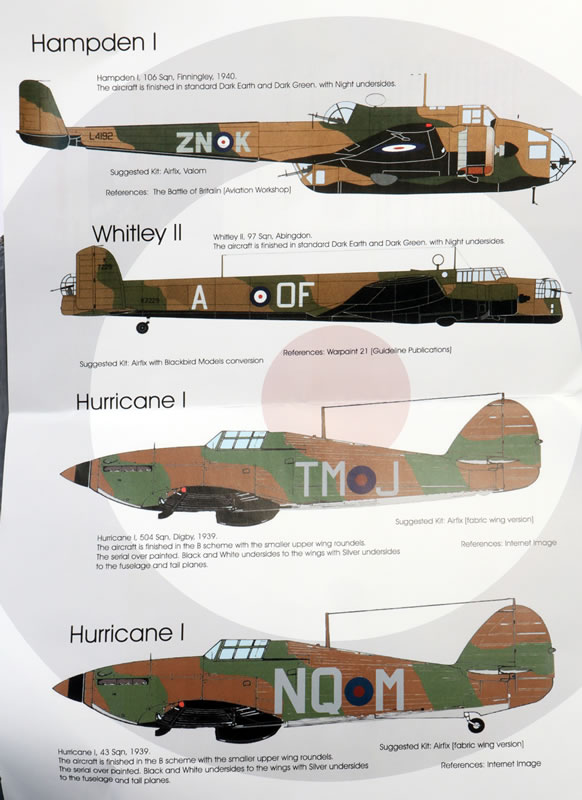 A general criticism is that we are only presented with one view of each aircraft, starboard elevation for the bombers and port for the fighters. It would have been nicer to have extra drawings of the other side of each fuselage and the plan view as well. I would not expect all purchasers of this sheet to have access to the camouflage schemes for all aircraft. It is also a point to note that at this early stage of the war, there was still confusion among those given the task of painting up their charges as to the ‘correct’ layout of squadron and individual code letters. This is noticed with the Hampden which has them incorrectly arranged - was it the same on the port side? It was an official RAF direction that the squadron letters should be towards the front of the aircraft and the individual aircraft letter towards the rear.