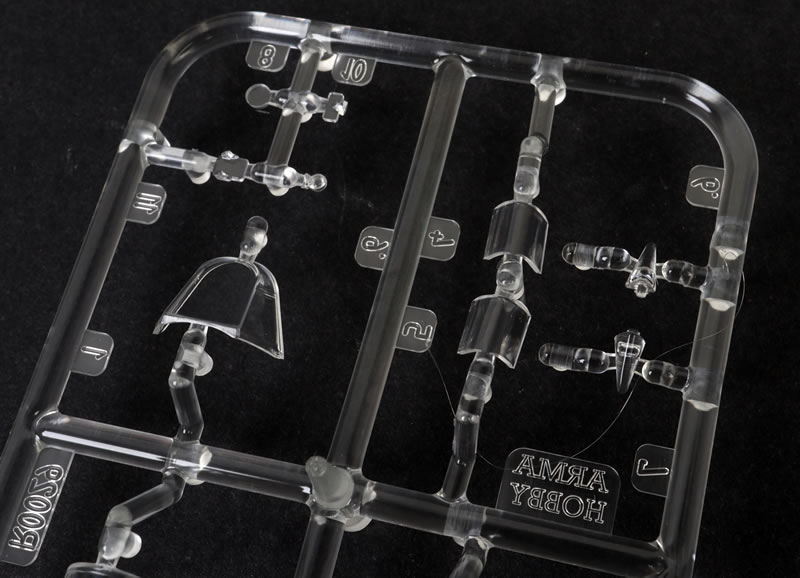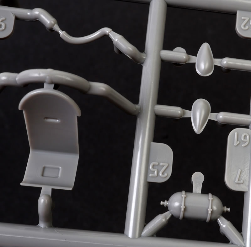 93 parts in grey plastic; eleven parts in clear plastic; self-adhesive canopy and wheel masks; markings for four aircraft options; link to downloadable 3d detail parts. |