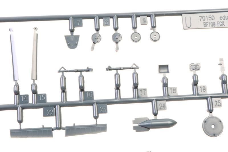 Around 150 plastic parts in grey and clear plastic (many marked not for use); coloured and brass photo-etched frets; self-adhesive canopy and wheel masks; markings for six aircraft; instructions.