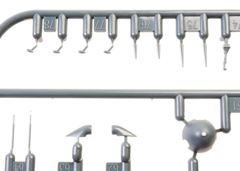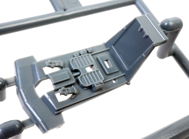 Inside the box are two large dark grey sprues and one smaller one in a resealable clear sleeve and a smaller one with transparencies.