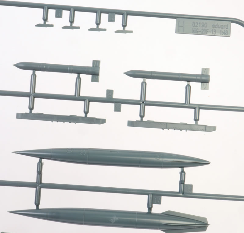The comprehensive ordnance sprue includes a centreline 490-litre fuel tank, two UB-16 rocket pods, two S-24 rockets, two R-3S missiles and two FAB-250 bombs, plus a selection of pylons.