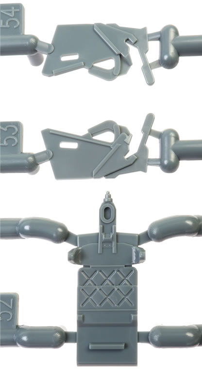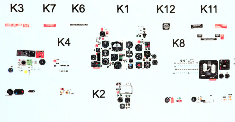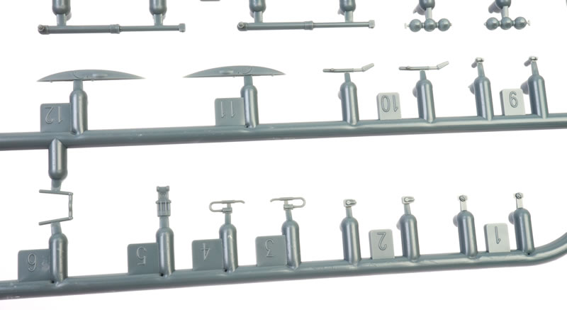 203 grey plastic parts (eight unused), 20 clear parts (four unused), a colour photo-etched fret, self-adhesive die-cut masks and markings for six aircraft.. |