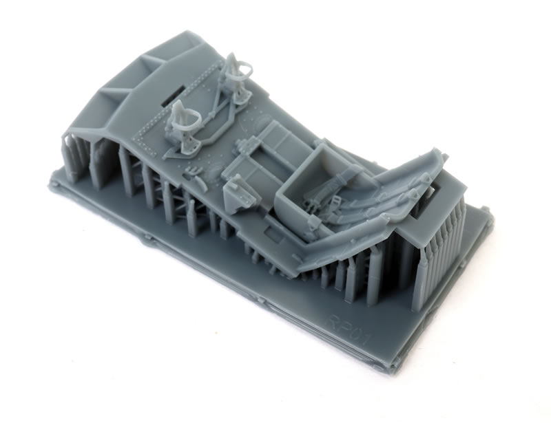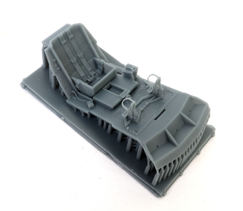 Resin parts include an combined cockpit floor, rear bulkhead, pilot’s seat with harness straps printed in place, rudder pedals and even toe straps.