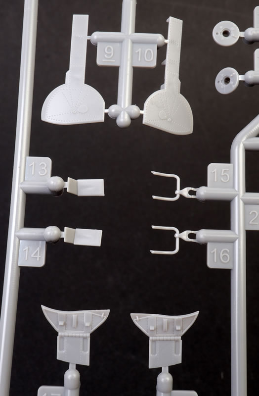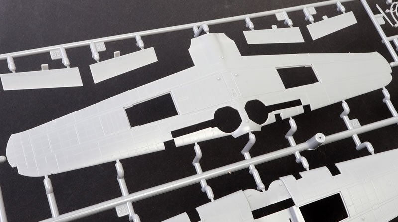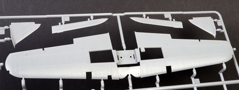 The wheel wells are packed with structural detail. Inserts are included for the upper and lower machine gun access hatches, while the flaps, ailerons, and rudder are all separate and may be posed to taste.