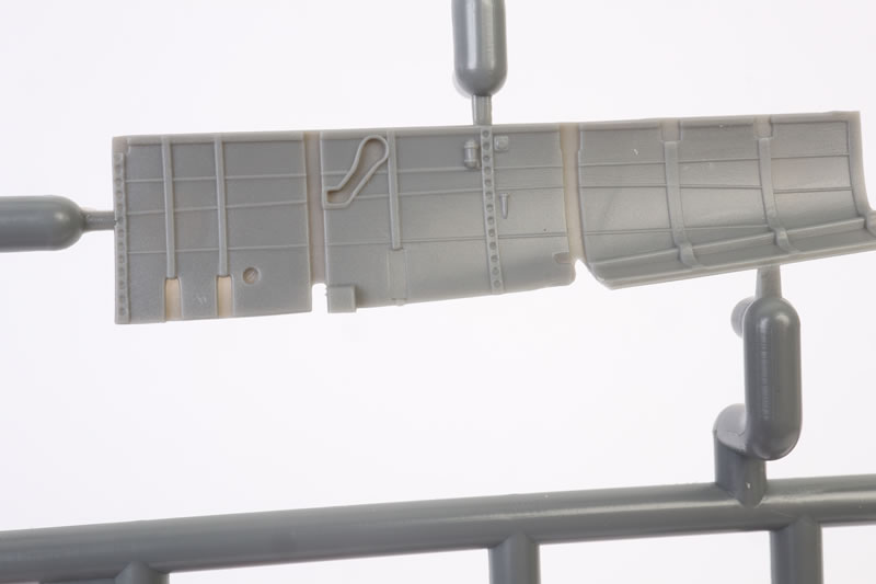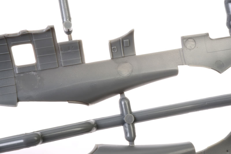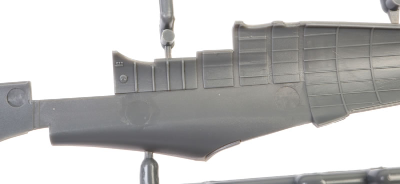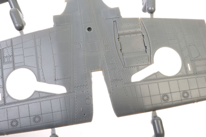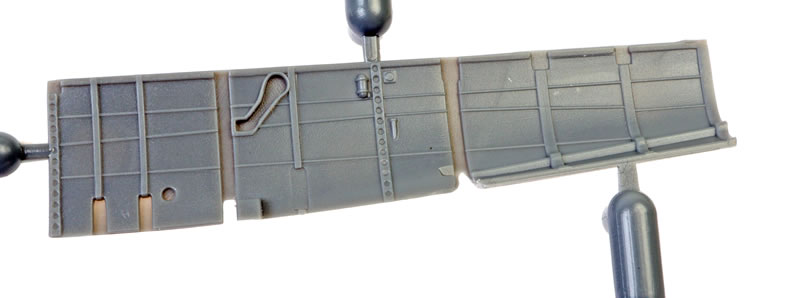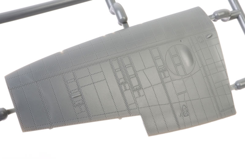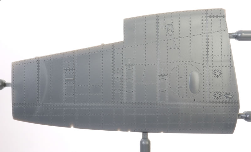 The upper wings feature the kidney shaped bulges to accomodate the main wheels. Machine gun access panels are moulded shut.