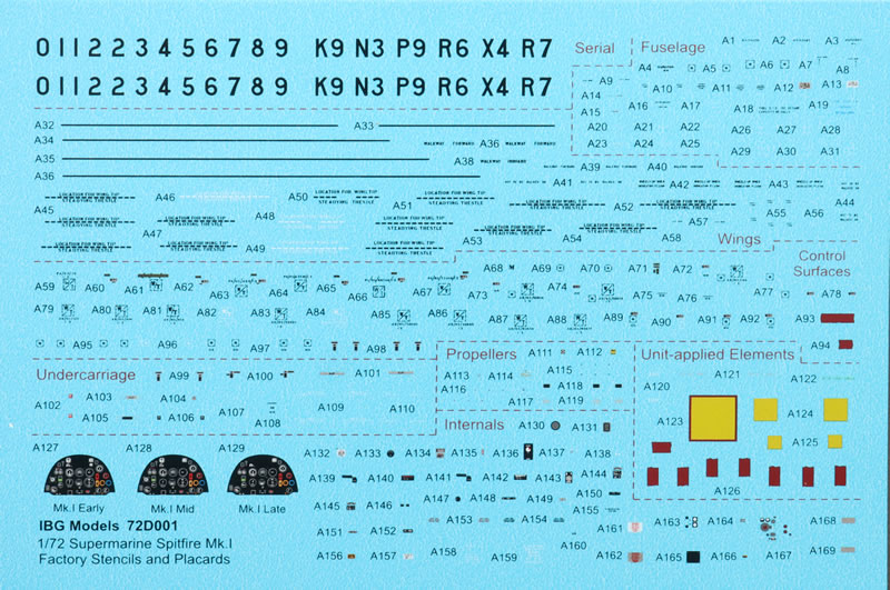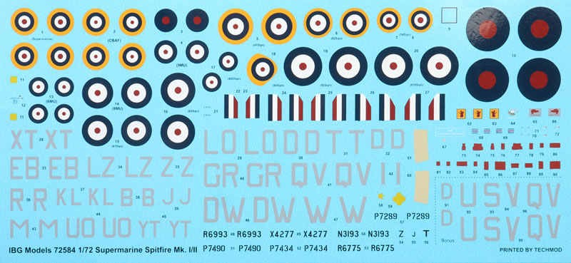 IBG's 1/72 scale Black Box Supermarine Spitfire Mk.I and Mk.II comprises 348 parts in grey coloured plastic, 46 parts in clear, two brass photo-etched frets; self-adhesive die-cut masking sheets; 3d printed resin parts (two cockpits, two pairs of main wheels, two pairs of exhaust stacks; mirrors (interior and exterior), two carburetor air intakes) and markings for ten aircraft.