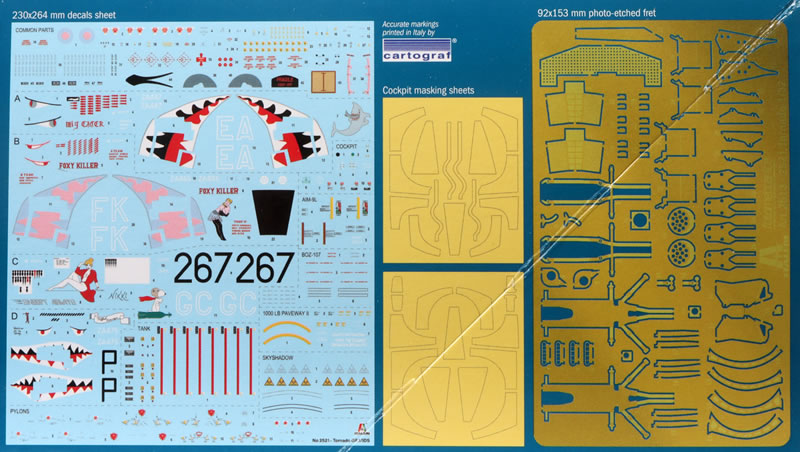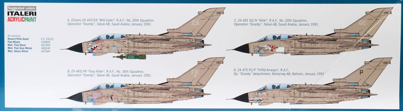 The large and perfectly printed Cartograf decal sheet features four marking options, all from RAF squadrons deployed to the Gulf—"Nikki", “Foxy Killer”, “Triffid Airways”, and “Mig Eater”. Each is complete with distinctive nose art and mission markings.