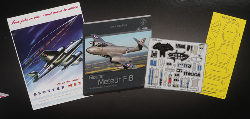The “First Edition” label delivers not only the plastic parts but also pre-coloured photo-etched cockpit parts plus canopy and wheel masks. A nicely produced A3 poster and a Duke Hawkins reference book rounds out the package.