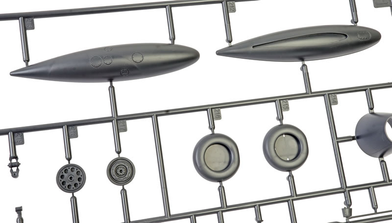 388 pieces moulded in dark grey plastic; 17 clear plastic parts; one colour photo-etched fret; self-adhesive die-cut masks for canopy and wheels; markings for five nicely varied options, marking guide; 48 page instructions. |