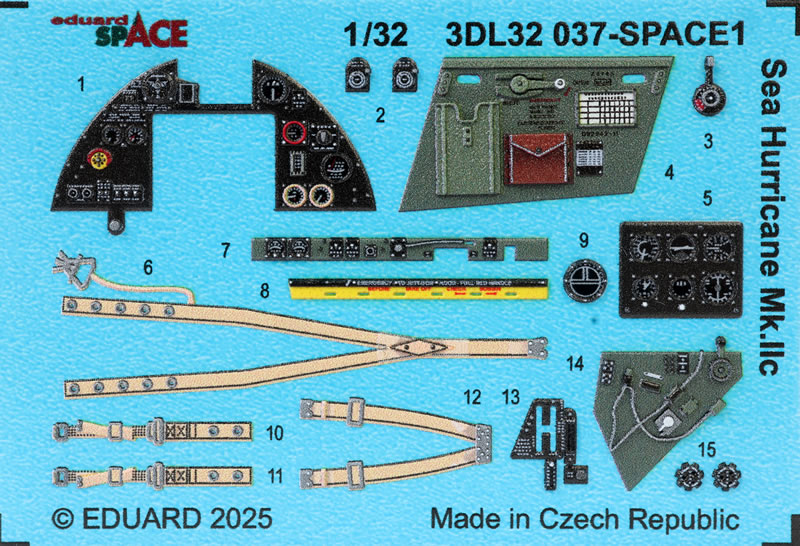 This SPACE set comprises 3D printed decals for the instrument panel and placards, plus photo-etched parts for the half-tone harness straps and throttles.